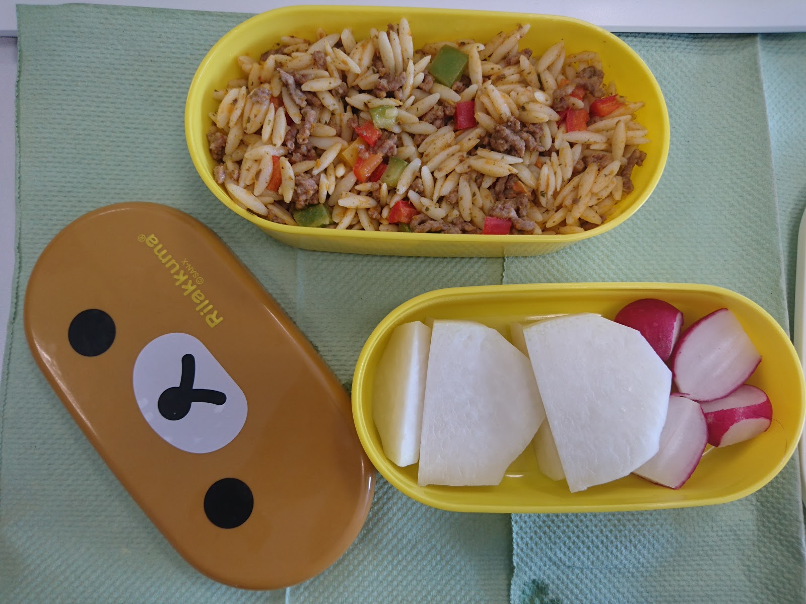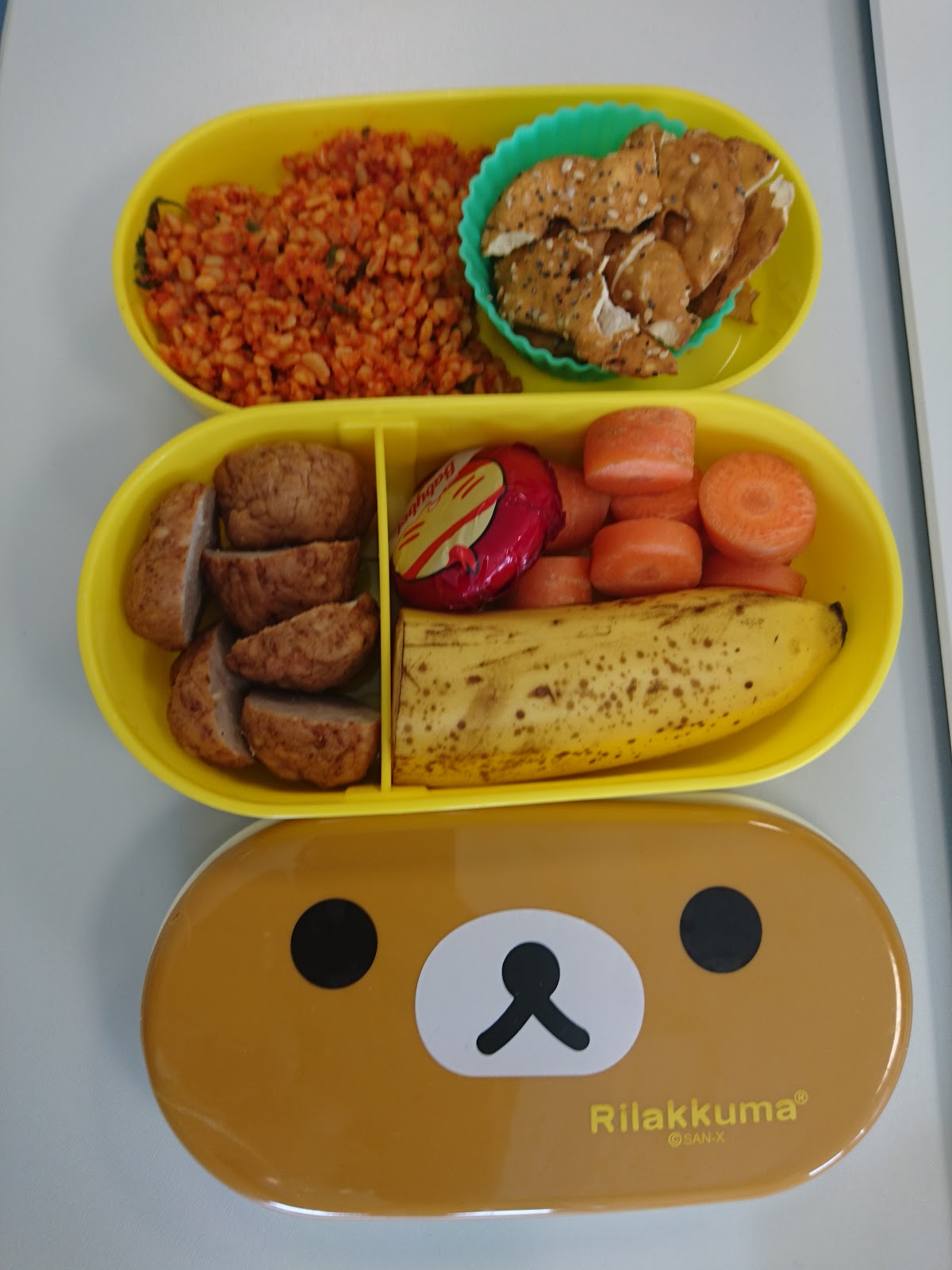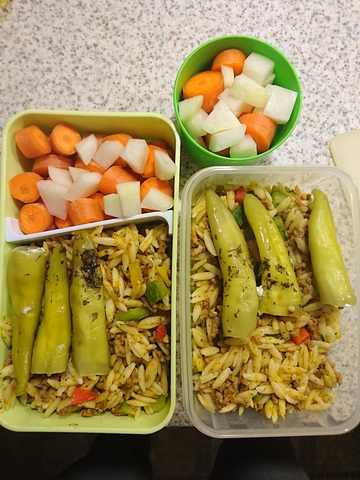 Diesmal habe ich für eine Woche, um mal für Abwechslung vom Bulgursalat zu sorgen, einen Salat aus Reisnudeln (Rezept bei Chefkoch) gemacht. Da ist schon etwas Fleisch drin und Gemüse, er ist lecker und gut haltbar. Dazu Minibrezel, Käse oder auch Hackbällchen und Banane. Der Reisnudelsalat hat sich auch inzwischen zu einem Favoriten gemausert.