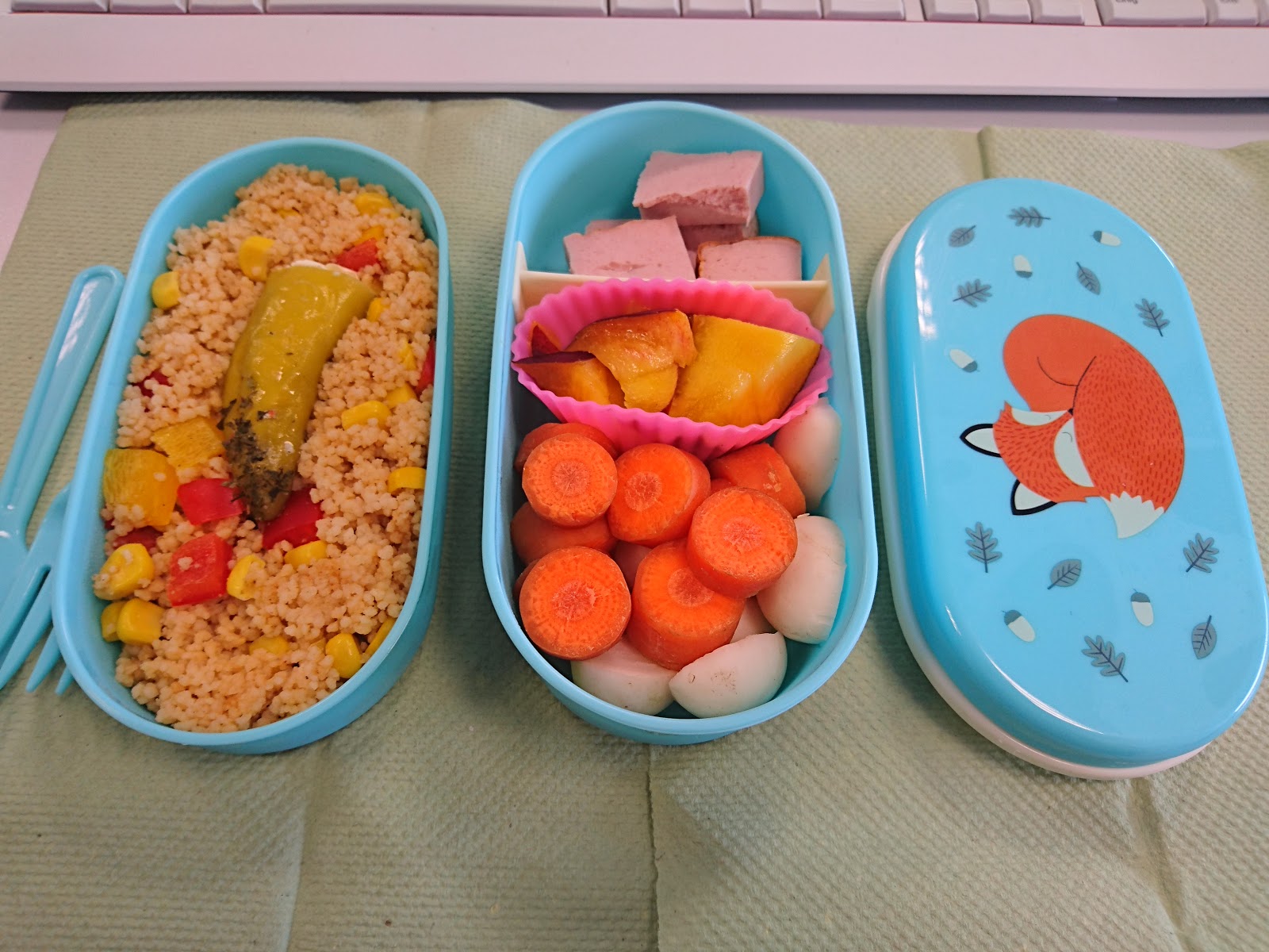 Nächste Woche nächstes Rezept für die Bento Box. Couscous Salat ist ganz schnell zubereitet. Diesmal Salat ohne Fleisch, haben wir uns für Leberkäse als Beilage zu den weißen Radieschen und gefüllten Peperoni entschieden. Außerdem gab es Obst. In kleinen Mengen für mich (ja gab gleich Halsschmerzen und ’ne dicke Lippe bei der Nektarine), da blieb auch mehr für die zweite Box über.