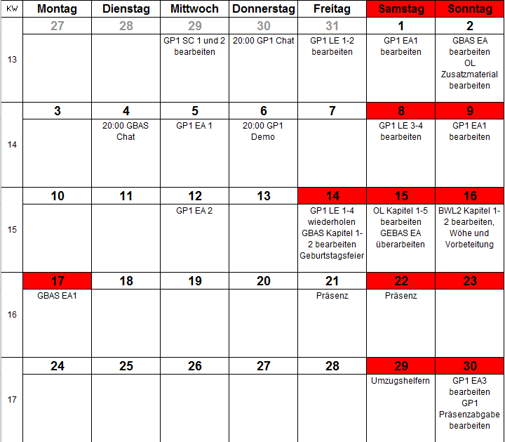 Damit hab ich mir meinen Kalender geschnappt alle bekannten Termine aus dem Studium eingetragen, die Termine in der Familie eingetragen und dann ging es los mit der Arbeitsverteilung. Momentan mache ich recht häufig Überstunden, damit ist lernen unter der Woche immer etwas schwierig. Daher hab ich mir erst mal die Wochenenden vorgenommen und diese für lernen, lesen, üben und Abgaben bearbeiten eingeplant.