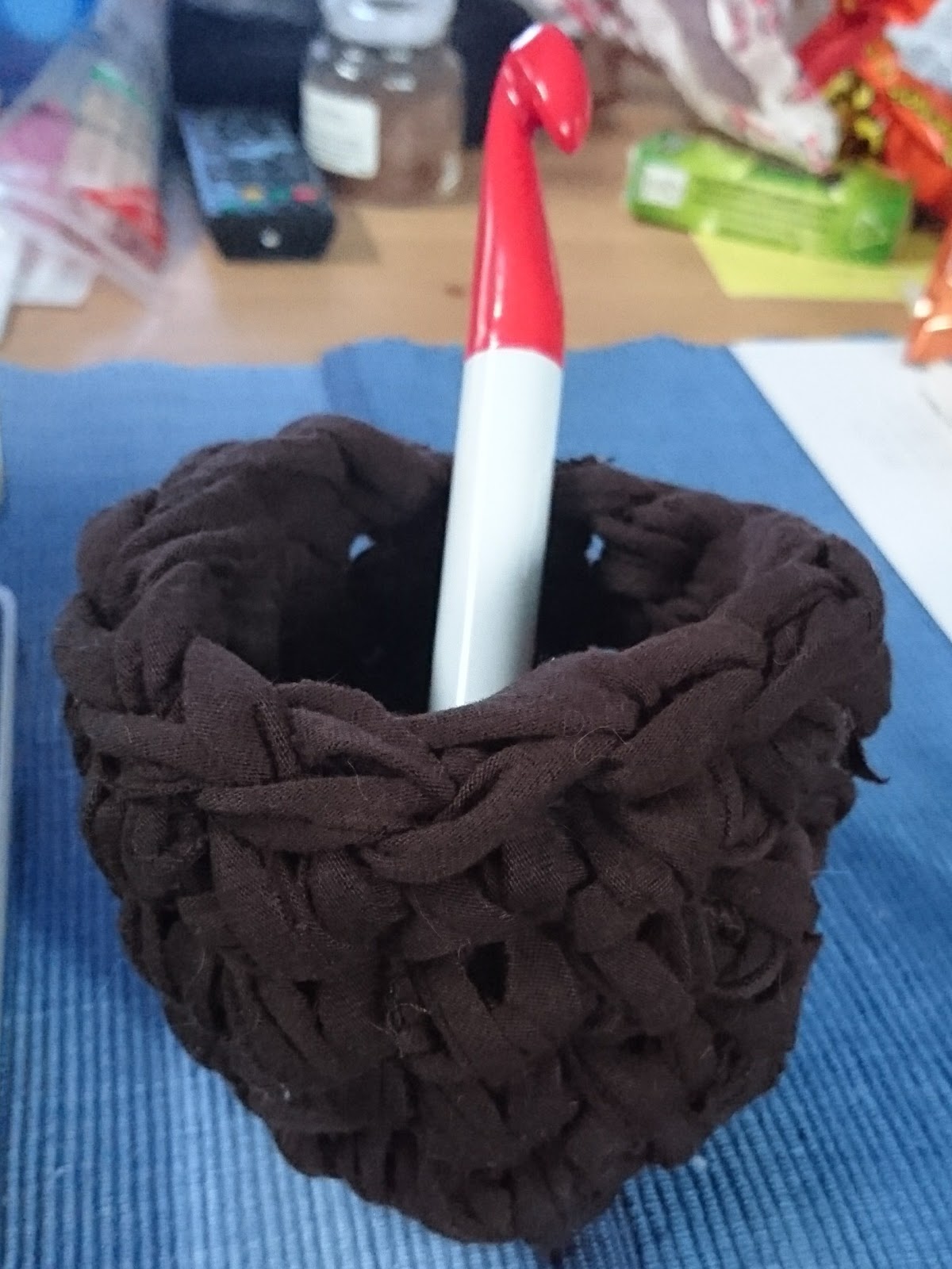 Tatsache, der Stoff hat gereicht! Aber es ist selten hässlich und das DIY Garn ist viel zu dick! Wie soll man so bequem darin irgendwas transportieren? NOPE! Mir reicht es. Die 3 alten Knäuel sind verwurstet aber mehr als Utensilo ist da einfach mit DIY Textilgarn einfach nicht drin.