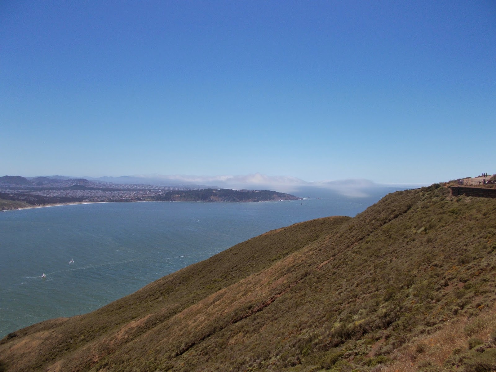 Weil zwei verschiedene Ansichten auf die Brücke nicht reichen, ging es als nächstes über die Brücke zu einem kleinen Pier für Angler. Immer noch nicht genug ging es als nächstes die Berge hoch zu einem Aussichtspunkt. Die Aussicht auf die Brücke wurde also noch einmal besser. Dort kann man durch eine alte Verteidigungsanlage noch höher auf den Berg und die Aussicht auf die Brücke und die Bay war atemberaubend. Gleiches gilt für die Aussicht raus auf das Meer.