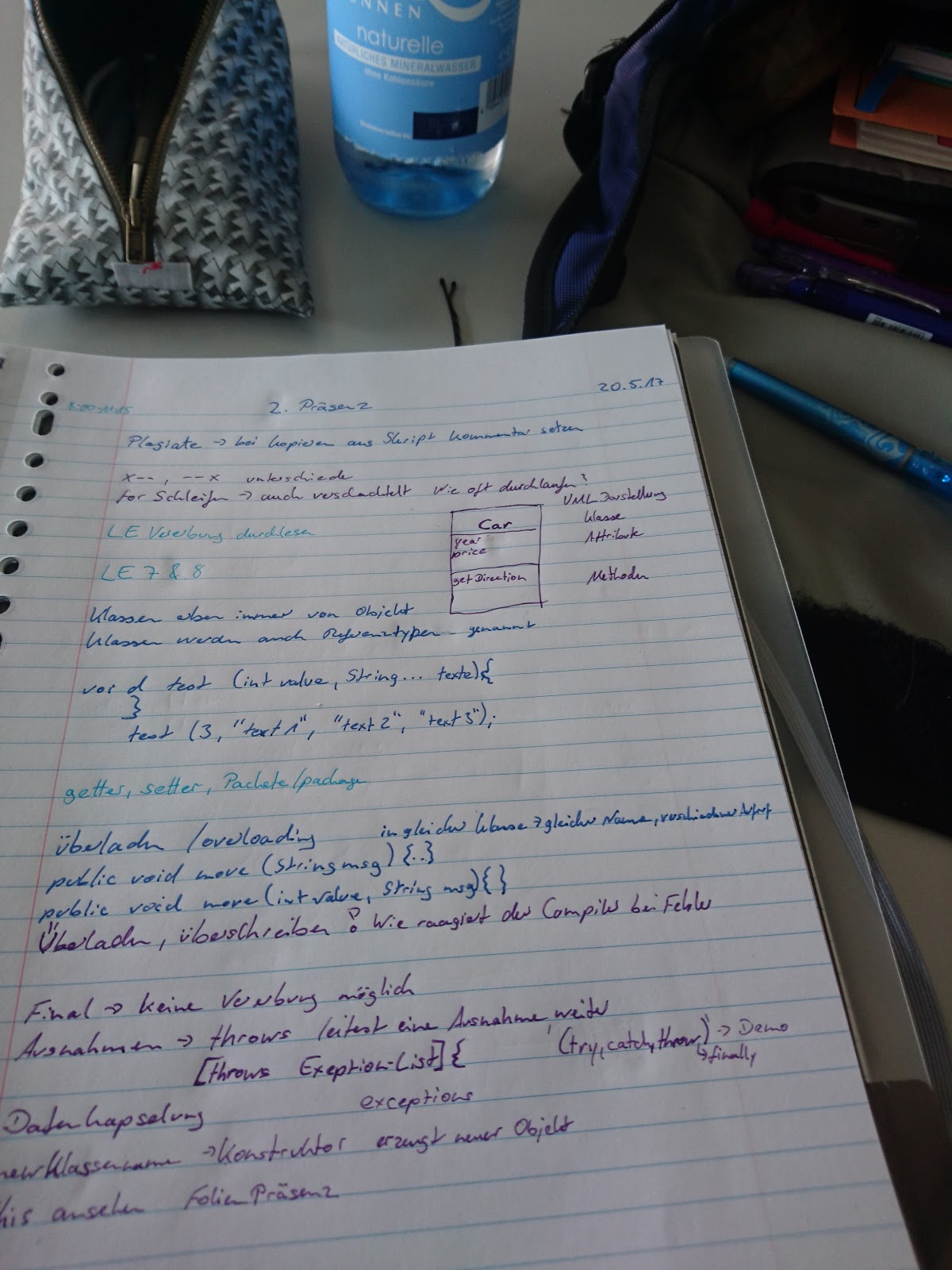 In der letzten Vorlesung wurde noch neuer prüfungsrelevanter Stoff besprochen, der nicht im Skript behandelt wird. Obwohl die Vorlesung etwas verkürzt wurde, ist doch einiges zusammen gekommen. Die nächste Einsendeaufgabe steht in dem Modul nun an und in Programmierung muss auch die Präsenzaufgabe noch bearbeitet werden. Es geht also fleißig weiter aber erstmal wieder nach Hause. Verspannt und geschafft sage ich: